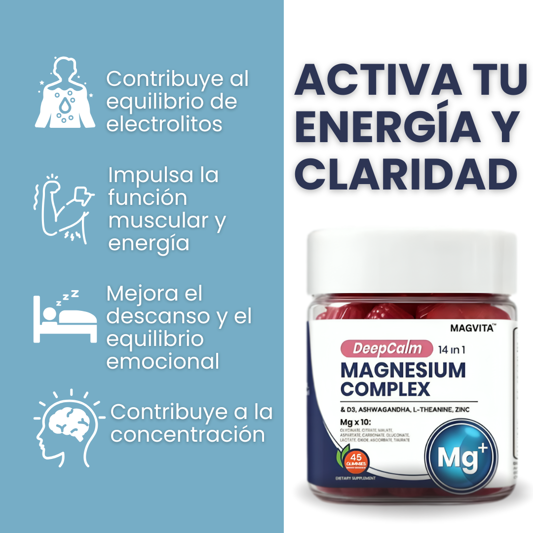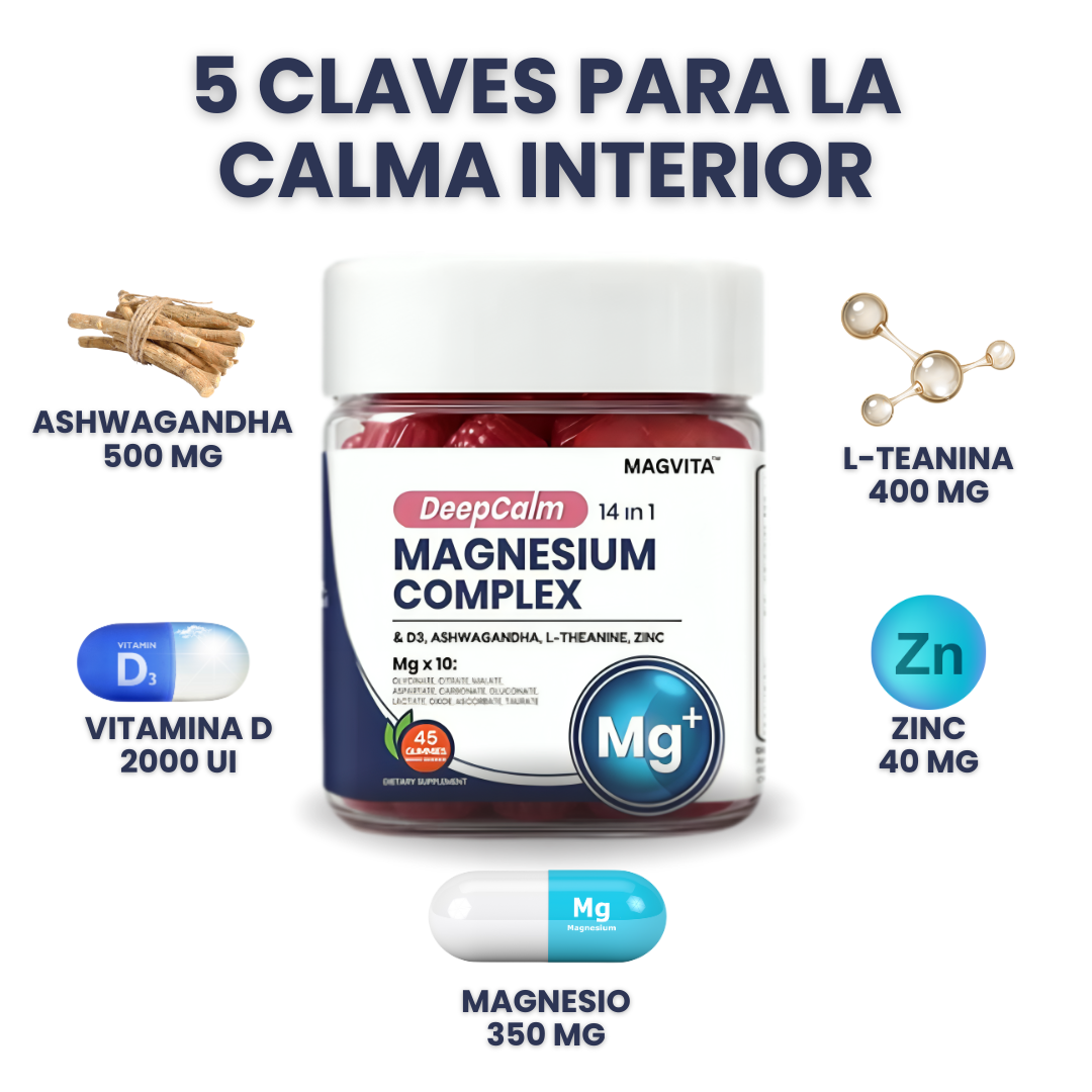 La diferencia es la fórmula 14 en 1. Mientras que el magnesio simple solo ofrece 1 o 2 tipos, DeepCalm contiene 10 formas diferentes de magnesio (Mg x 10) para garantizar la máxima absorción y cubrir todas tus necesidades (sueño, músculos, energía). Además, está potenciado con Ashwagandha y L-Teanina para un manejo del estrés superior.