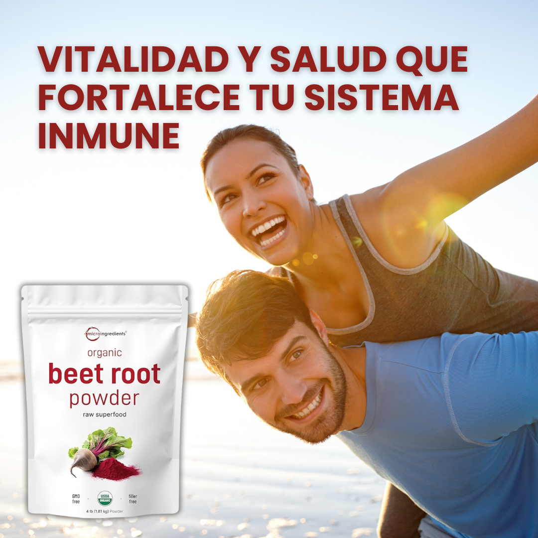 El beneficio principal es lamejora del rendimiento físico y la resistencia. El polvo es extremadamente rico en nitratos naturales, que tu cuerpo convierte en óxido nítrico. Esto ayuda a dilatar los vasos sanguíneos, mejorando el flujo de oxígeno y nutrientes a tus músculos durante el ejercicio.